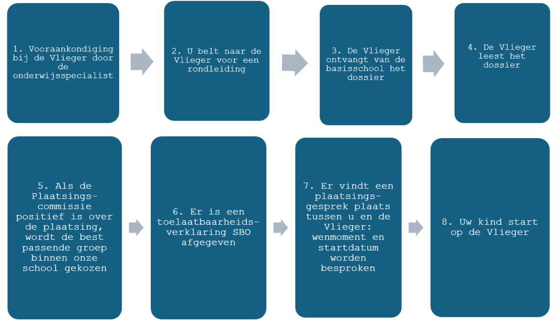 De betrokken onderwijsspecialist vanuit het samenwerkingsverband stuurt via OT@sbodevlieger.nl een vooraankondiging (onder vermelding van: initialen, geboortedatum, school van herkomst en schoolloopbaan) als uw kind mogelijk de overstap naar het SBO gaat maken.